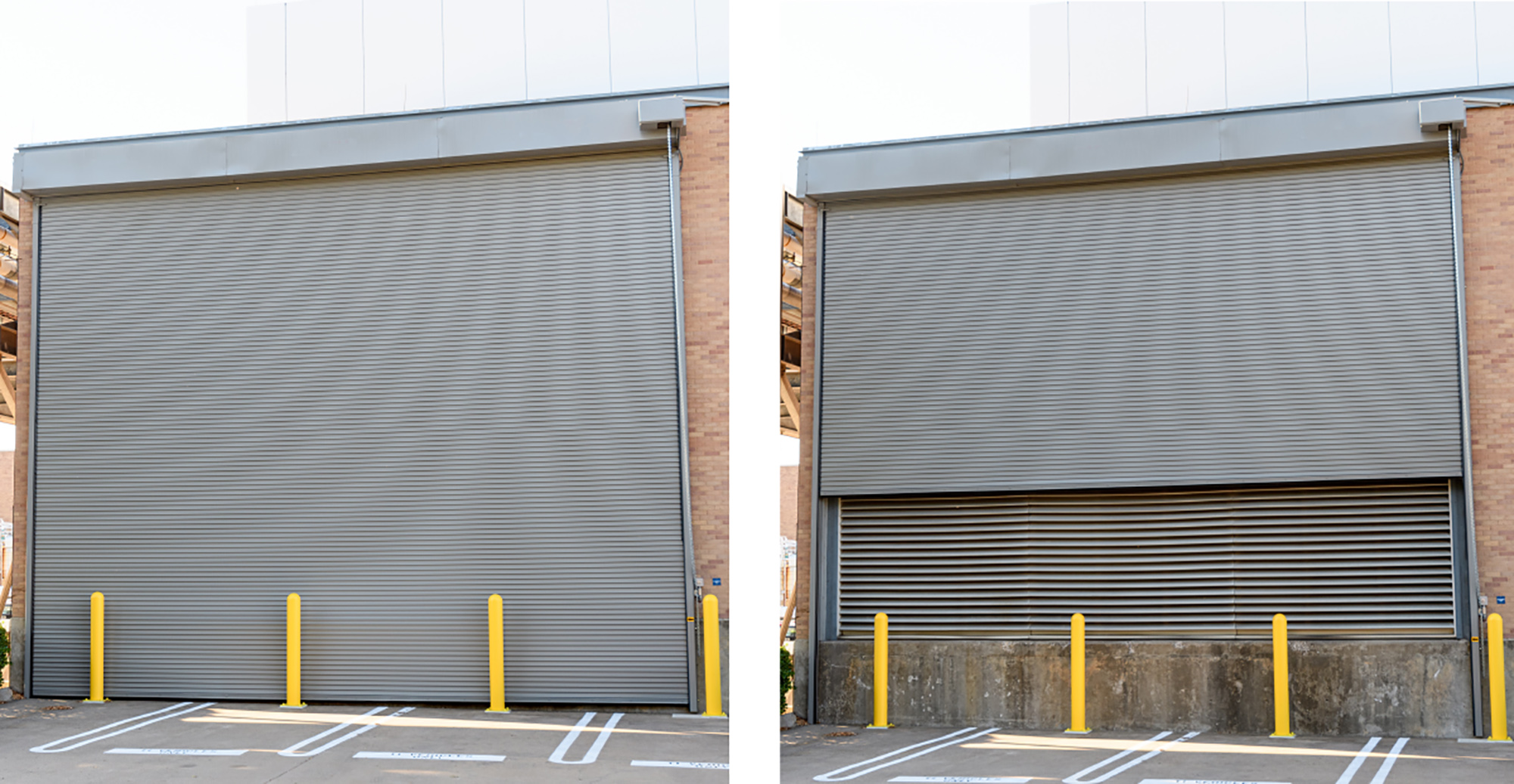 The DH Pace team assessed the situation and assisted the customer in evaluating several different options. Due to the large size of the opening and the need to close the opening quickly, a power operated custom rolling steel door was selected. The door was fabricated and installed on the exterior of the ventilation wall with a heavy-duty operator to allow for quick and safe operation. To add security, the operator can only be activated by authorized personnel using a key switch.